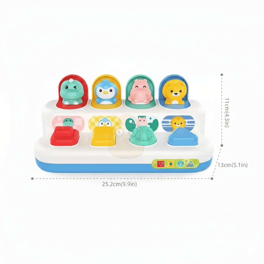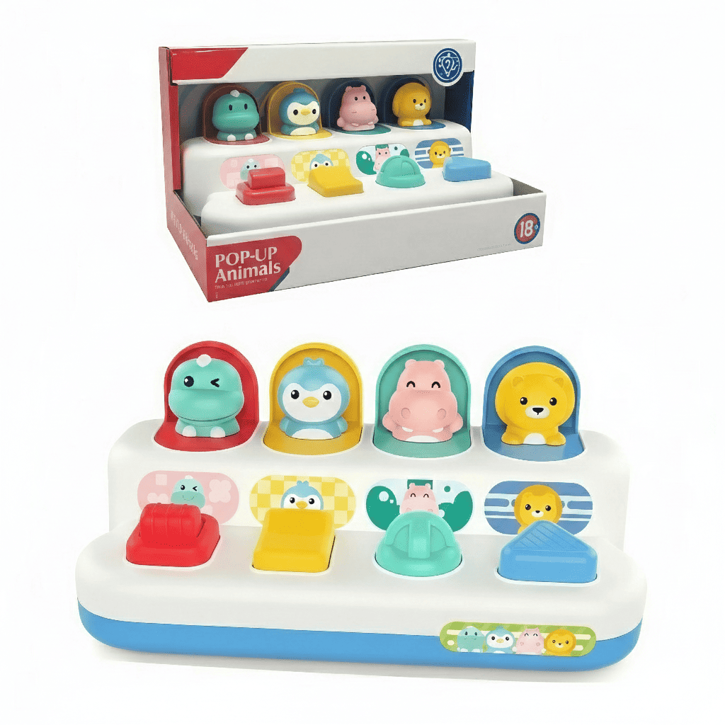 Juguete PopUp Didáctico para bebé con animalitos 🎉 Estimula el desarrollo cognitivo de tu bebé con este juguete interactivo que combina sorpresas y aprendizaje. Cada animalito que emerge del popup refuerza la coordinación mano-ojo y la motricidad fina 🐰🦁🐸. Diseñado con colores vibrantes y texturas variadas, captura la atención del pequeño mientras desarrolla habilidades sensoriales fundamentales. Seguro, duradero y perfecto para bebés en etapa de exploración 👶✨. Un clásico educativo que acompaña el crecimiento con diversión garantizada 🌟